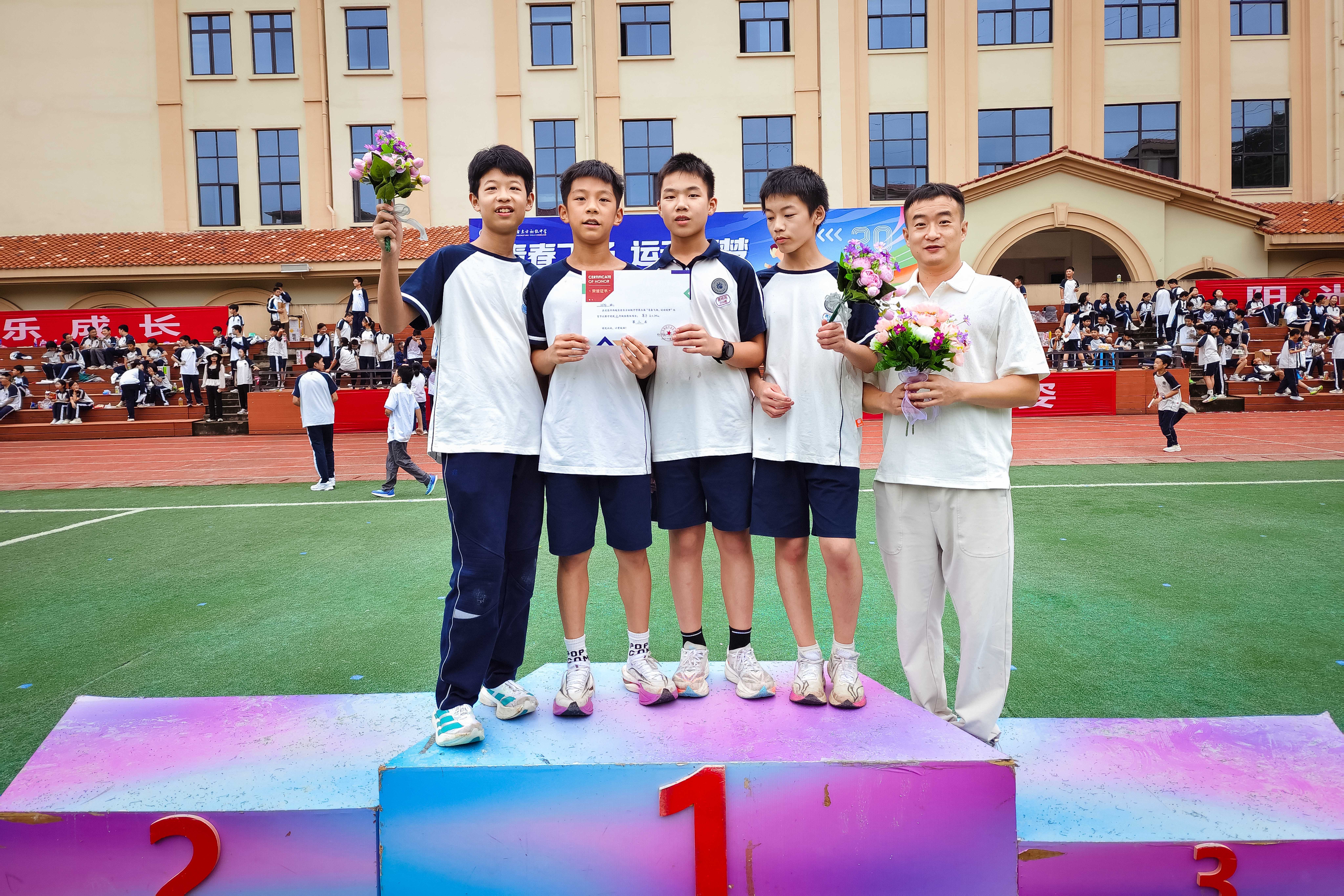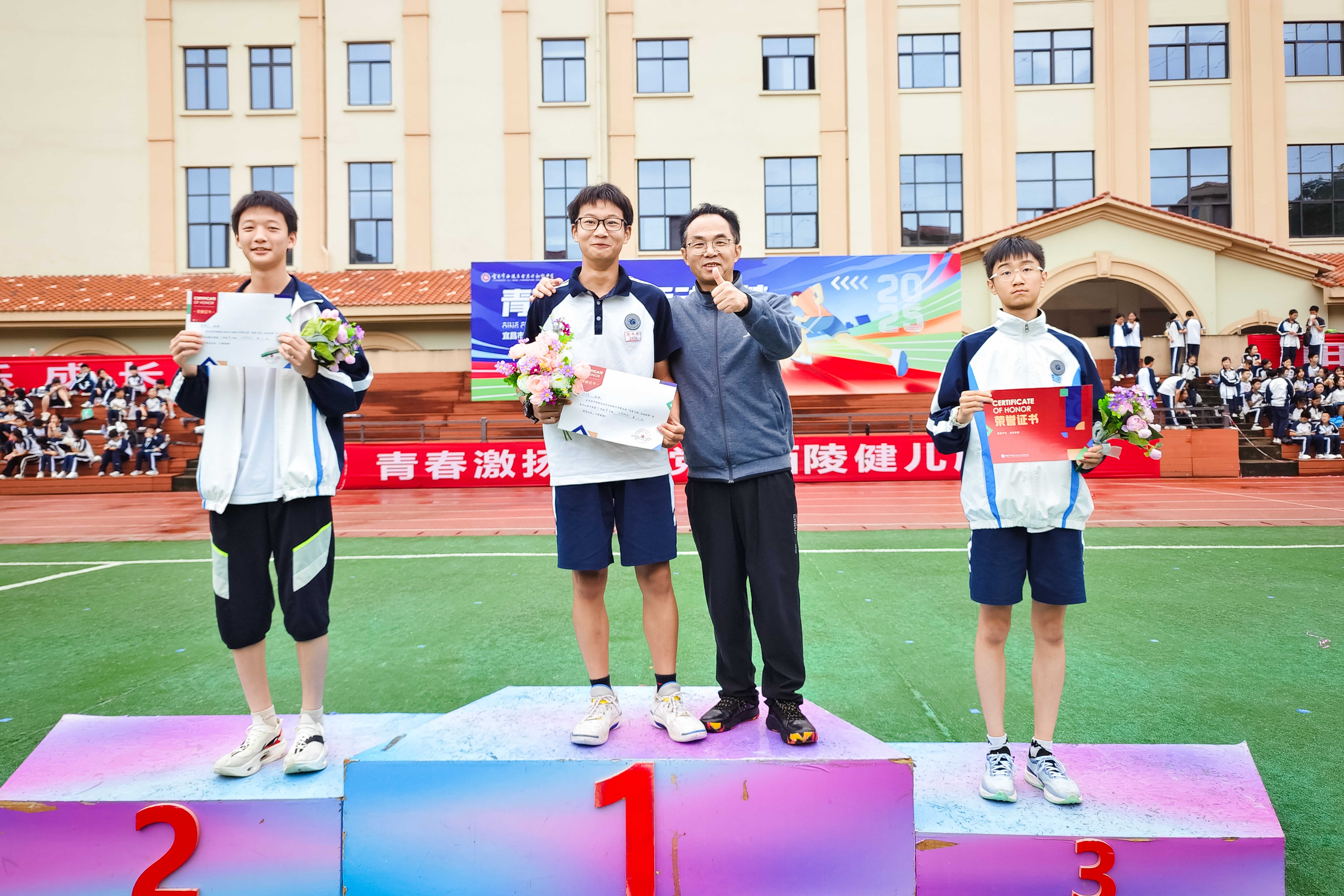 百米冲刺的咬牙坚持,接力区内的精准传棒,无不彰显着少年不服输的倔强。田赛场同样精彩——跳高选手纵身越过被雨水打湿的横杆,实心球划出优美的弧线落入湿软的草坪。最动人的是千米耐力跑,当有同学体力不支放缓脚步,总会有同伴伸出援手,陪跑的身影成为赛道上最温暖的风景。这一刻,名次已不再重要,守望相助的情谊比任何奖牌都更加闪亮。