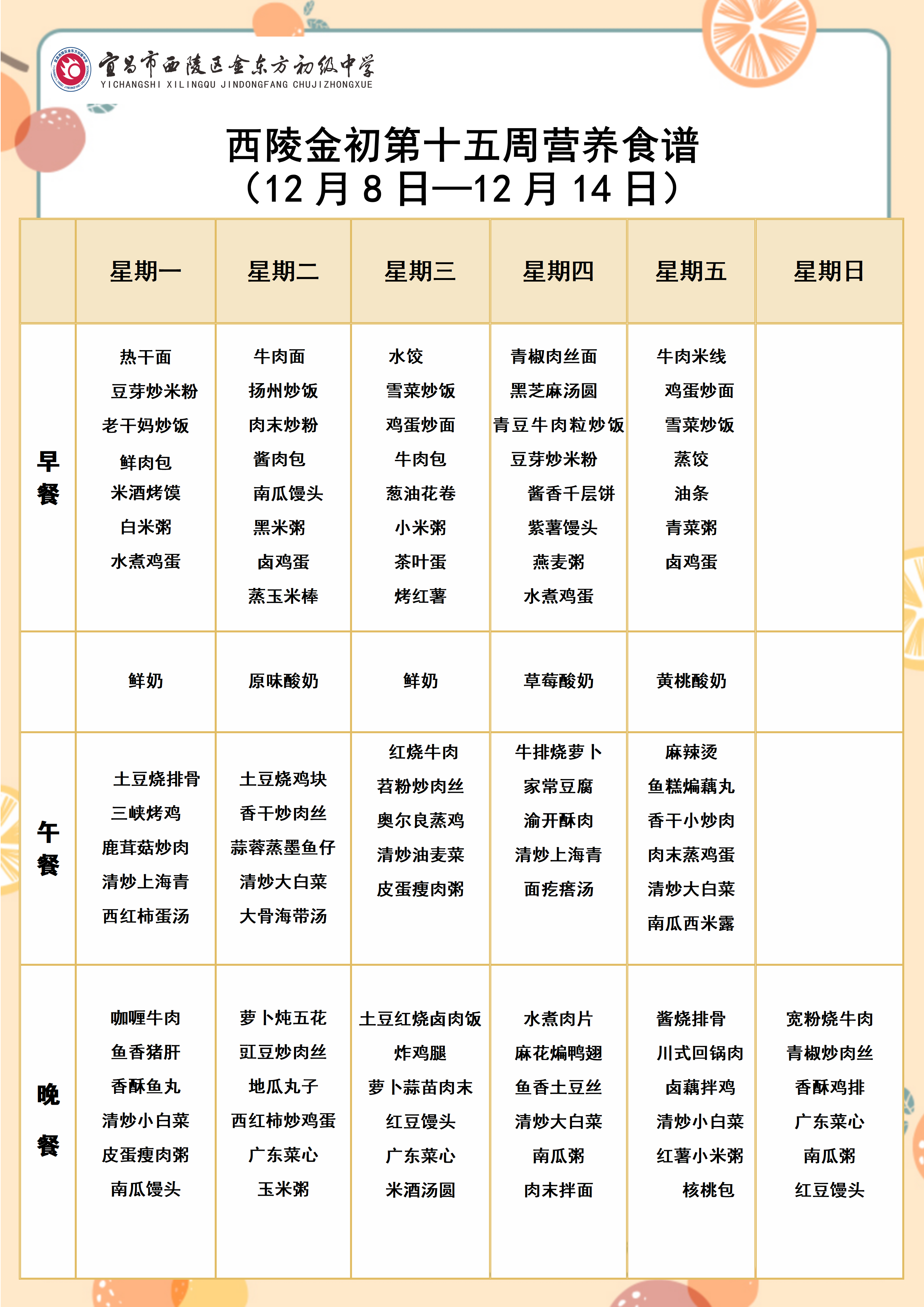 西陵金初2025年秋季学期第十五周营养食谱