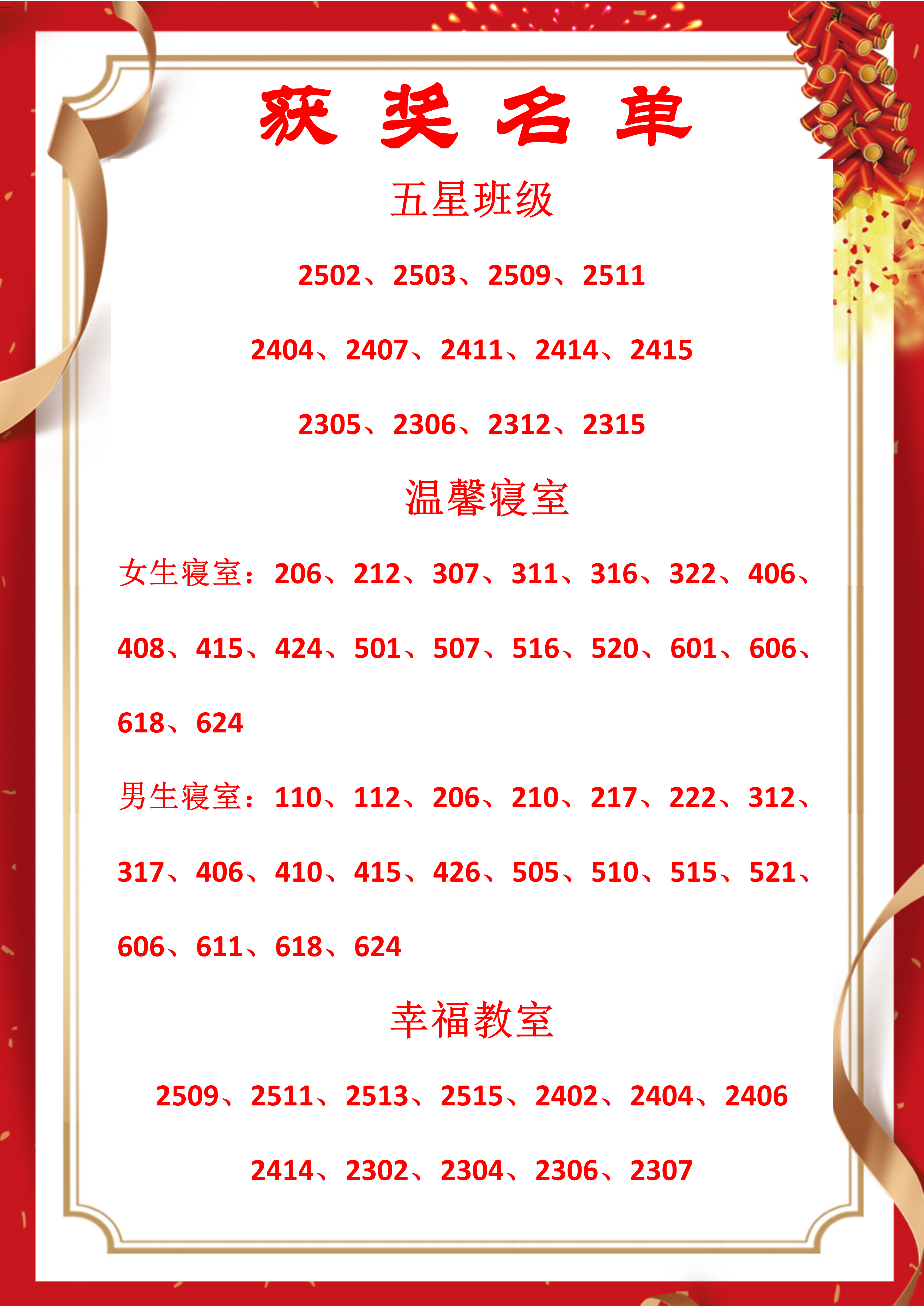 在过去的一个月中,各班级、寝室在多个方面展现出良好的精神风貌与集体凝聚力。经综合评定,学校对安全守纪、文明爱校、勤奋好学、活动展示等各方面表现优秀的班级,授予“五星班级”荣誉称号;对教室卫生雅洁、学习氛围浓厚的教室,授予“幸福教室”荣誉称号;对寝室卫生干净,相处氛围和谐、自理能力较强的寝室,授予“温馨寝室”荣誉称号。希望全体同学向优秀看齐,共同营造更加温馨、积极、有序的学习与生活环境,助力“四园式”学校建设。
