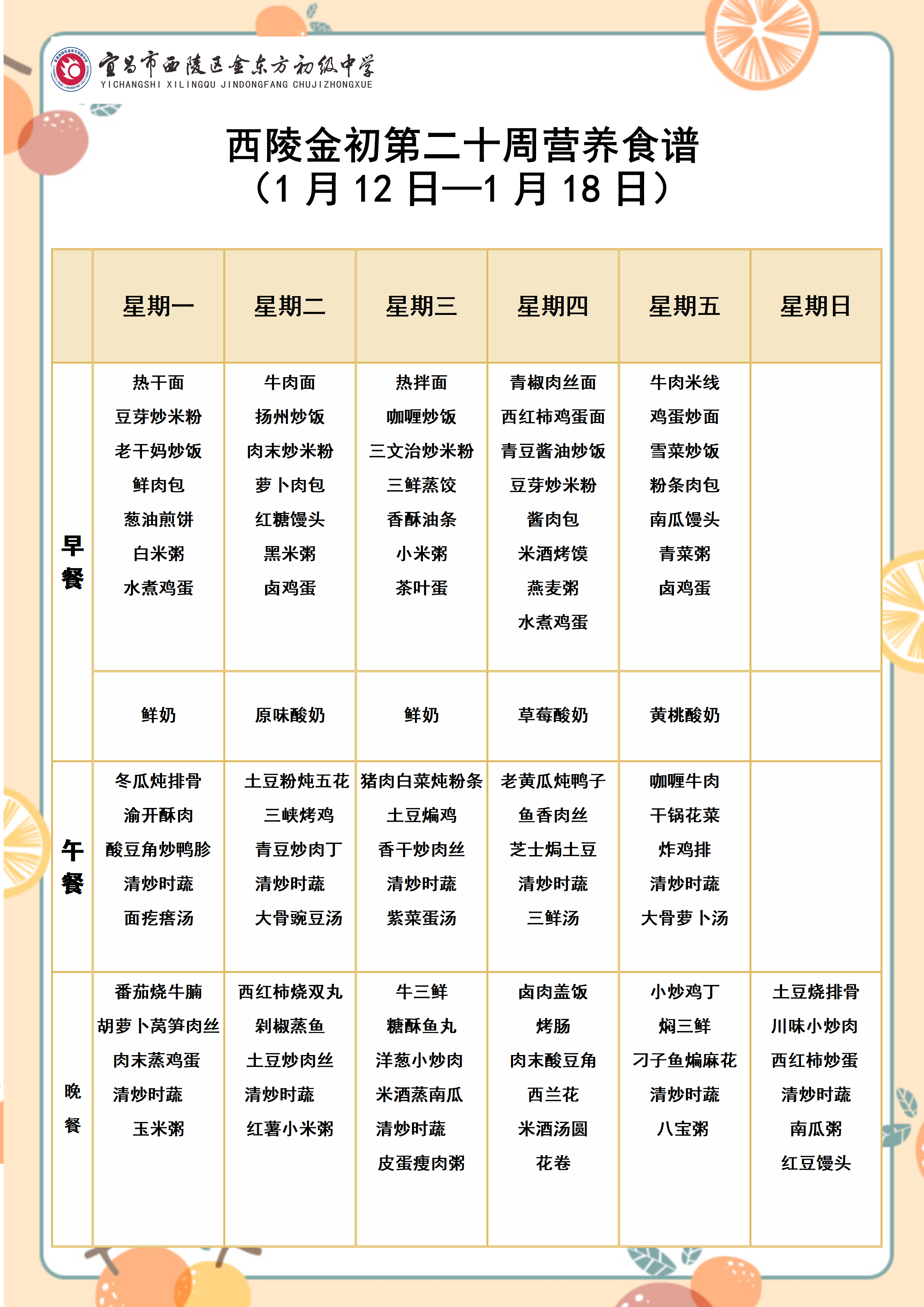 西陵金初2025年秋季学期第二十周营养食谱