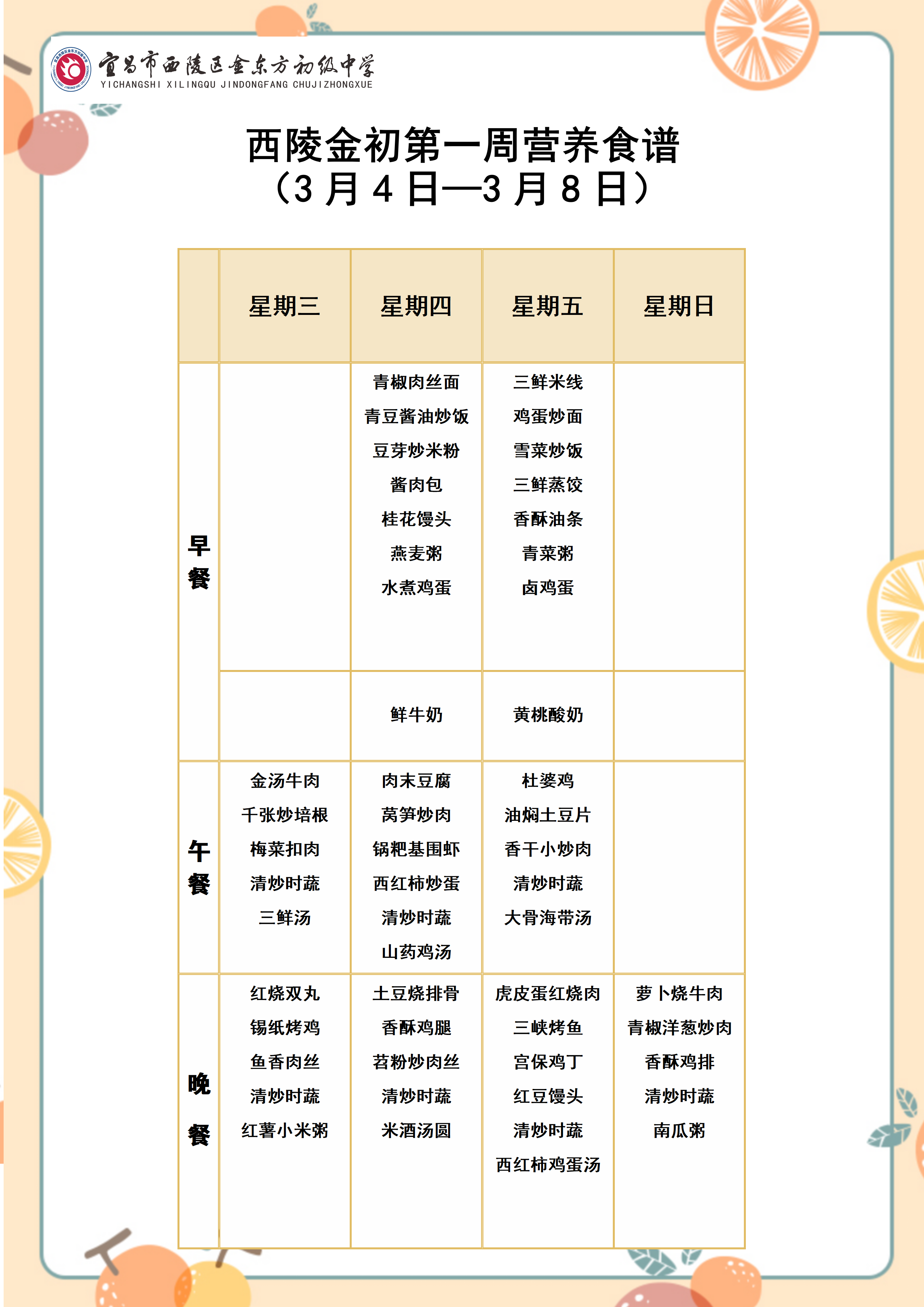 西陵金初2026年春季学期第一周营养食谱